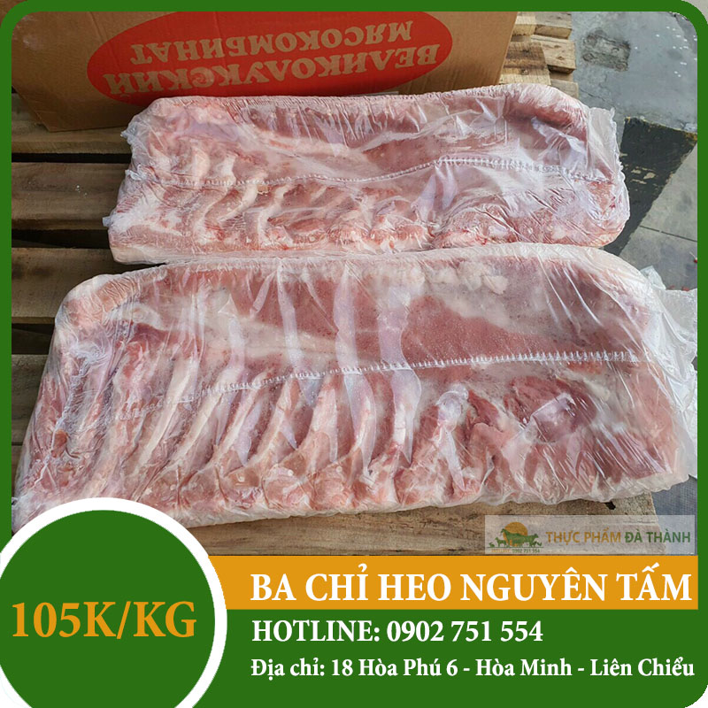 Thịt ba chỉ heo (ba chỉ heo) nhập khẩu Đức, Brazil, Nga,... đảm bảo nguồn gốc xuất xứ rõ ràng, là phần thịt heo ngon nhất, bắt mắt nhất được kết hợp bởi da, mỡ và thịt. Các lớp nạc và mỡ được xếp tầng xen kẽ, hoà cùng với phần da heo dai giòn trên bề mặt.