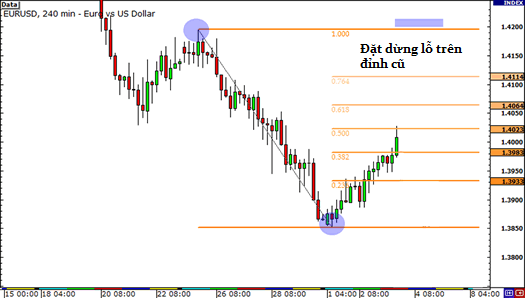 Nếu bạn đặt lệnh bán ở Fib 50, bạn cần đặt lệnh dừng lỗ nằm trên Fib 61.8 Nguyên nhân nằm sau phương pháp này là một khi bạn tin tưởng giá sẽ đảo chiều ở Fib 50 có nghĩa bạn cho rằng Fib 50 sẽ rất mạnh và nếu giá vượt qua đây chứng tỏ ý tưởng của bạn đã sai.