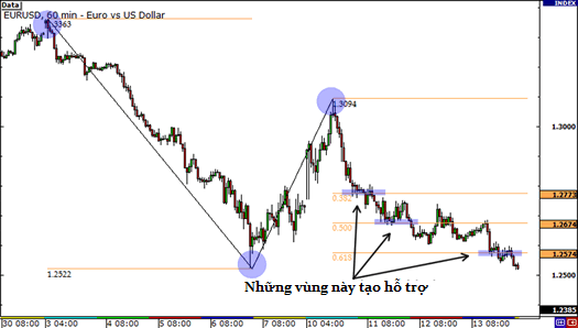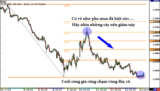Xem thêm 1 ví dụ đối với xu hướng giảm ở EURUSD (đây là ví dụ trong bài Fib kết hợp mô hình nến)