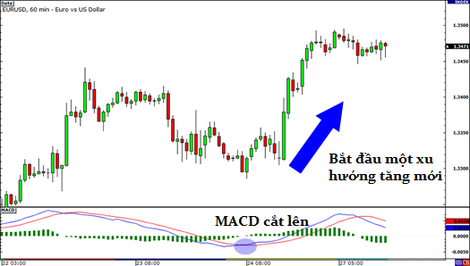 Trên biểu đồ 1H của EURUSD, đường nhanh cắt đường chậm tại thời điểm histogram bằng 0. Điều này gợi ý rằng khả năng xu hướng giảm sẽ xoay chiều Từ đó, cặp EURUSD bắt đầu tăng điểm lên và hình thành xu hướng tăng. Hãy tưởng tượng rằng bạn đặt lệnh mua sau giao cắt, bạn đã có thể kiếm khoảng 200 pips lợi nhuận rồi Tất nhiên cũng có những trở ngại khi dùng MACD mà điểm nổi bật là MA thường bị chậm sau giá, đồng thời, nó cũng chỉ là bình quân của giá mà thôi.