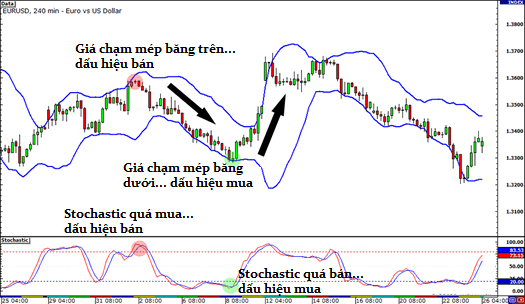 Bạn có thể thấy rằng tín hiệu bán từ BB và Stoch xuất hiện với EURUSD khi cặp tiền này chạm vào dải băng trên của BB, lúc này đóng vai trò kháng cự. Tại thời điểm đó, Stoch rơi vào trạng