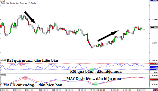 Tiếp theo, RSI đi xuống vùng quá bán và cho dấu hiệu mua, rồi MACD cũng cắt lên, cho tín hiệu mua. Giá đã tăng trở lại đúng như tín hiệu