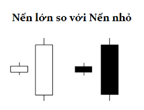 Cũng giống như con người, biểu đồ nến có nhiều cỡ thân khác nhau. Ví dụ như thân nến dài thể hiện lực mua hoặc bán mạnh. Thân càng dài thì cường độ lực mua và bán càng cao. Điều này có nghĩa là phe mua hoặc phe bán đang kiểm soát thị trường vào thời điểm đó. Trong khi đó, thân nến ngắn thể hiện lực mua – bán yếu.